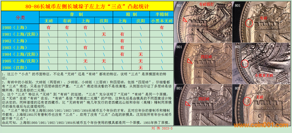 二、上海廠從1980年無磚開始到1985年間所有的生產(chǎn)模具(包含精制幣)都是在翻模的基礎(chǔ)上作簡單的修整出來的,主要是拋光環(huán)節(jié),所以基本上是一樣的;而沈陽廠從1981年至1986年間所有的生產(chǎn)模具(包含精制幣)都是在翻模的基礎(chǔ)上作簡單的修整出來的,主要是拋光環(huán)節(jié),所以基本上是一樣的;但上海廠序列和沈陽廠序列卻有很大的區(qū)別,從大的平臺階和斜臺階、少臺階和多臺階、邊緣的寬厚和窄薄不同外,還有很多不同的小方面,比如磚紋、長城圖形的細(xì)節(jié)上等等,而沈陽廠的無磚卻不是屬于沈陽廠這個序列,而是屬于上海廠這個序列,假如沈陽廠的無磚是沈陽廠所制,同樣一個制作團隊在這么短的時間內(nèi)就這么大角度否定自己上一個產(chǎn)品是不可思議的。