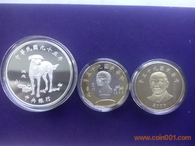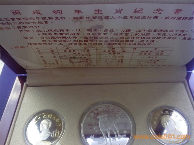 民國95年中央銀行生肖狗銀套幣帶盒,含100元1盎司銀幣,50元精制銅幣,20元精制雙色幣各一枚;