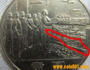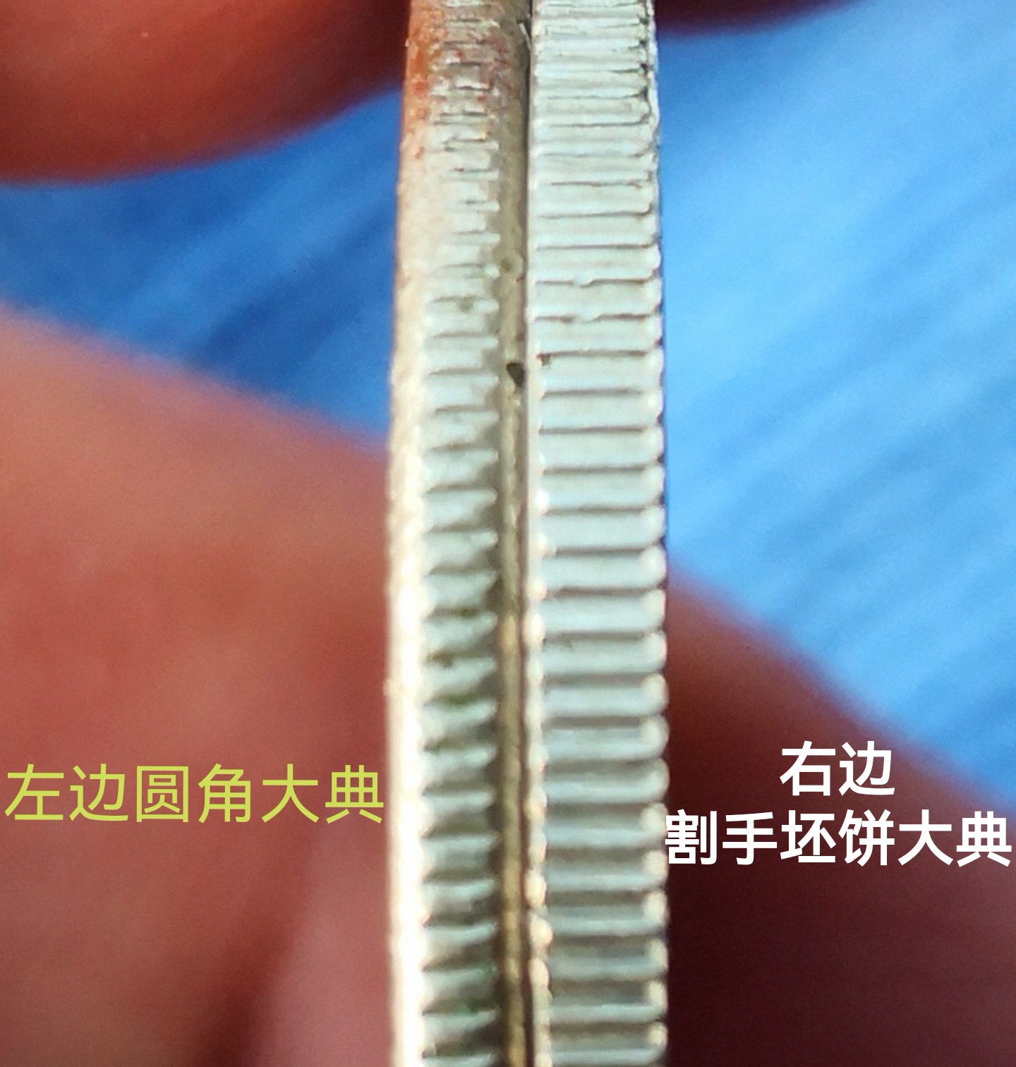 大典里那種最厚的全齒長齒能割手邊齒版,因?yàn)榕c劉必凱那枚精制(劉必凱語“半精制”)具有幾處同模傷,即左邊第四個(gè)旗幟是斷桿、紀(jì)念碑立柱低部是懸空的情況,再根據(jù)我國早期精制幣沒有獨(dú)立模具、都是利用普制幣模具翻出來的做法(一位造幣廠大咖應(yīng)邀來現(xiàn)代錢幣網(wǎng)論壇交流時(shí)語),又因?yàn)樵缙谖覈茙攀前凑战疸y幣工藝流程來制作的歷史事實(shí),故我的思路是:這樣的大典必然不是誤差形成的這樣邊齒。