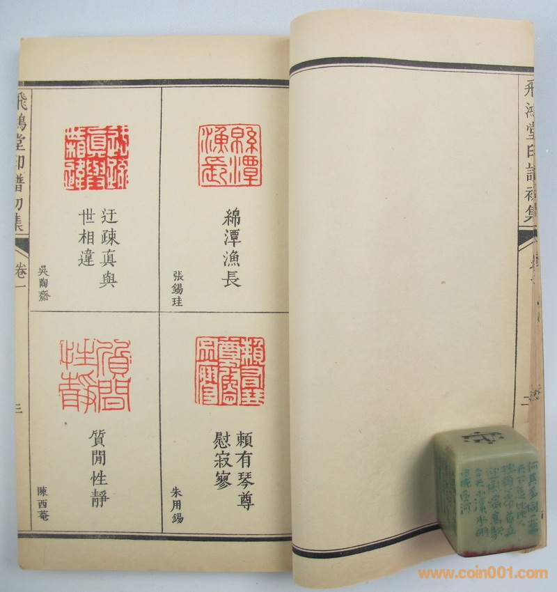 這是上周在趙涌在線拍到的印譜,乃1980年影印本。我出的價格不高,本以為難以成交,就一直沒關(guān)注。昨日上海趙涌在線來電,說我有一個拍品到了付款期限,今天上網(wǎng)查看,居然是這套印譜,這讓我有一點檢漏的感覺。 《飛鴻堂印譜》作為印學(xué)史上著名的“三堂印譜”之一,自1776年成書以來,一直在印人的心目中占有十分重要的地位?!讹w鴻堂印譜》,是清代汪啟淑于1745—1776年(乾隆10—41年)集拓,金農(nóng)、丁敬校定的大型總集式印譜。《飛鴻堂印譜》成書過程中,曾出現(xiàn)過多種版本,最后以五集四十卷定稿。由于成書時間長達31年,且規(guī)模寵大、序跋眾多、鈐拓精美,在當(dāng)時就產(chǎn)生了很大的影響。清末以來,影印《飛鴻堂印譜》者更是層出不窮。