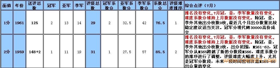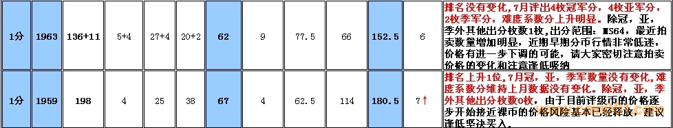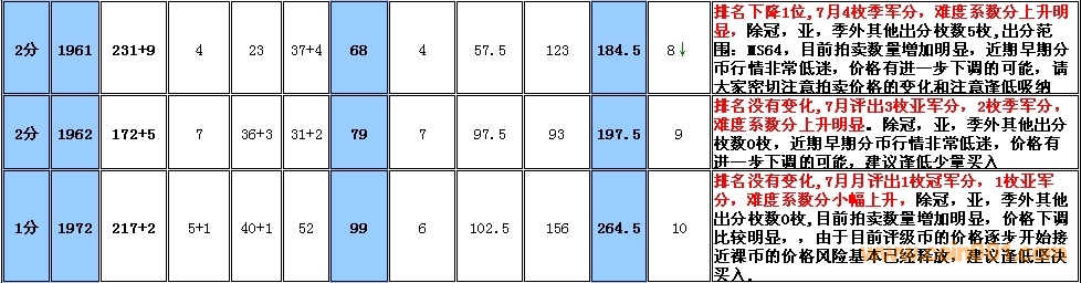 備:這個(gè)采樣的范圍會(huì)有一定的誤差,我將根據(jù)市場(chǎng)和評(píng)級(jí)量的變化每個(gè)季度第一周作出適當(dāng)?shù)恼{(diào)整,難度系數(shù)分在未來如果超過1000分將剔除。 1960年2分在一塵有大量貨源出現(xiàn),位置由原來的第一檔次調(diào)整到第二檔次。難度系數(shù)排序暫時(shí)保留,如分?jǐn)?shù)超過1000分將刪除,請(qǐng)大家留意!
