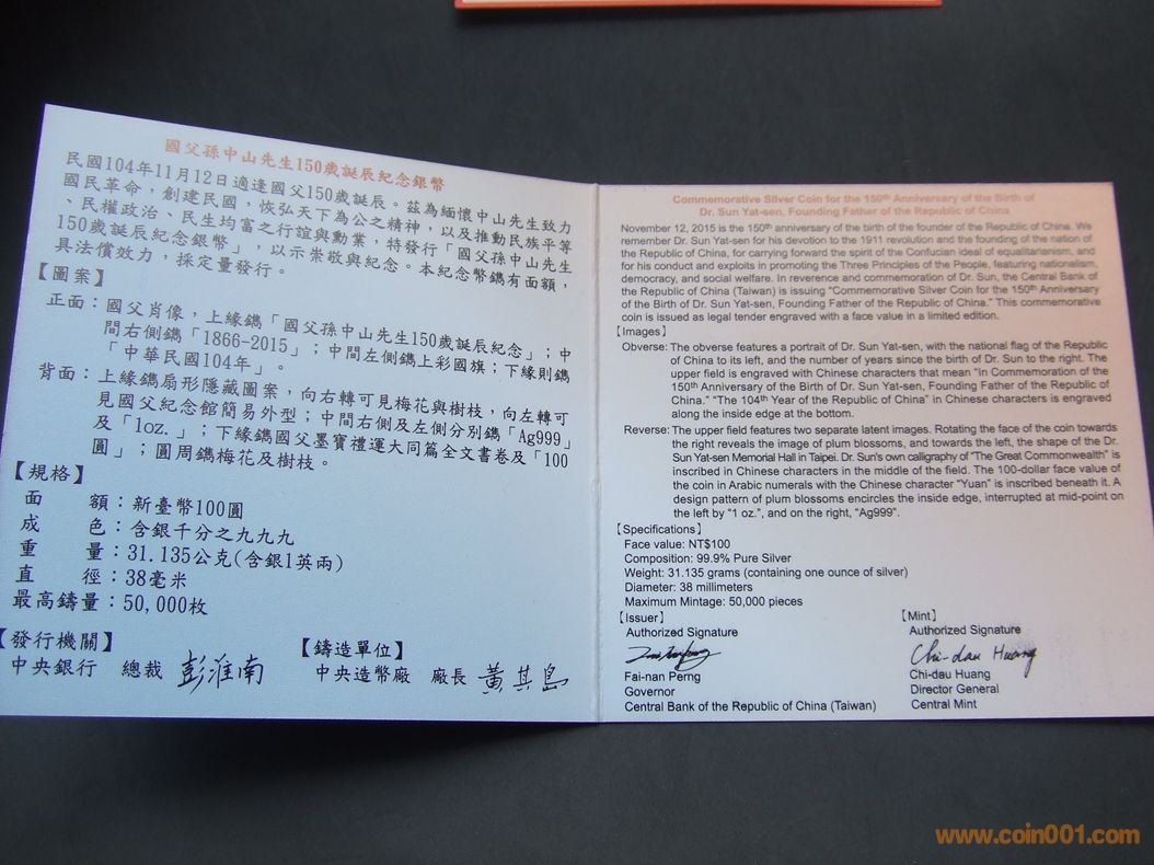 紀(jì)念銀幣面額為新臺(tái)幣100元,含銀1英兩,硬幣正面刻有國父肖像及彩色青天白日滿地紅國旗,背面上緣則有扇形隱藏圖案,輕微轉(zhuǎn)動(dòng)可見國花梅花及梅枝,以及國父紀(jì)念館外型,下緣則以雷射雕刻國父墨寶「禮嘰笸谷?。央行發(fā)行局局長施遵驊說:『(原音)我們做了一些最先進(jìn)技術(shù)的結(jié)合,第一點(diǎn),我們把國旗青天白日滿地紅是彩色的做在銀幣上,同時(shí)背後有扇形隱藏圖案,還有雷射雕刻國父的墨寶