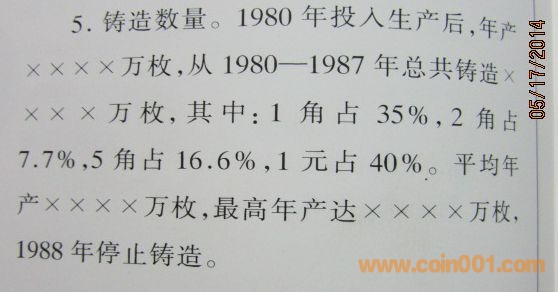 3、《當代中國印鈔造幣志》第226頁關(guān)于壹圓長城幣的生產(chǎn):1980年由上海造幣廠投產(chǎn)至1981年,1983年續(xù)產(chǎn)至1987年;1980年也由沈陽造幣廠投產(chǎn)至1987年。兩廠共造9638.4萬枚。