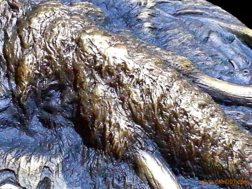 為了更好體現(xiàn)古猛犸象威猛生動的氣勢,采用了超高浮雕,尤其是象牙和象鼻部分,并特別以90MM尺寸加以體現(xiàn)。