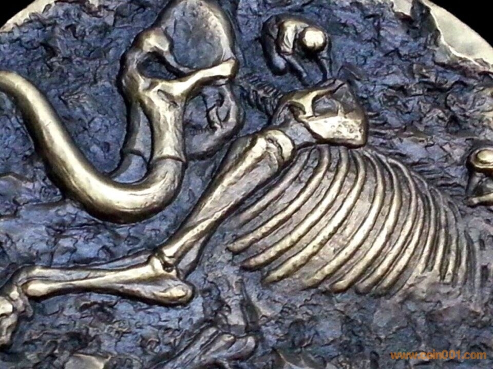 背面以陳彥文為主,二人共同完成設(shè)計(jì)雕刻,以化石挖掘現(xiàn)場為主畫面并輔以其它元素以專業(yè)考古的角度加以表現(xiàn),有別于一般單純化石標(biāo)本的單調(diào),特別真實(shí)并加以提煉的表現(xiàn)了野外科學(xué)探求精神。