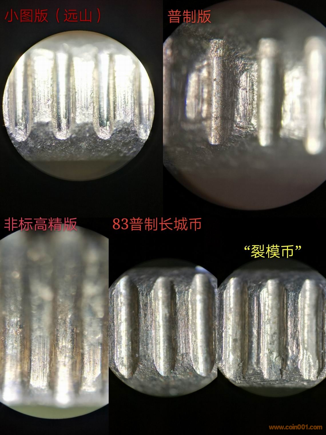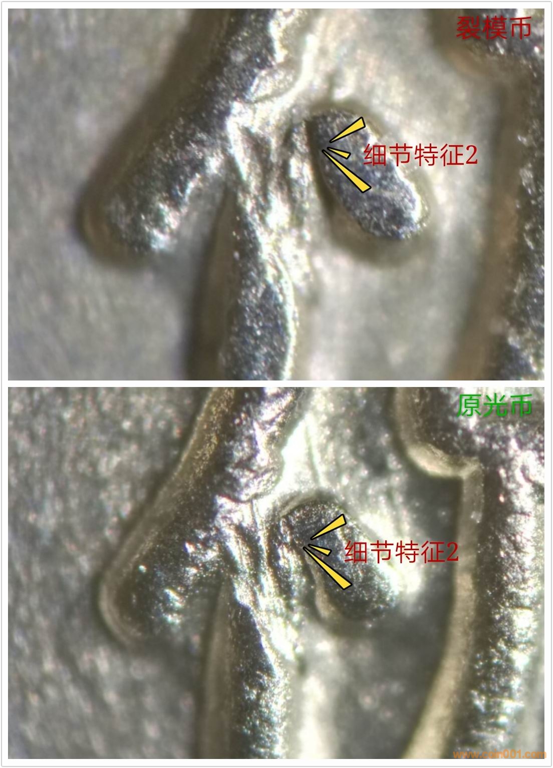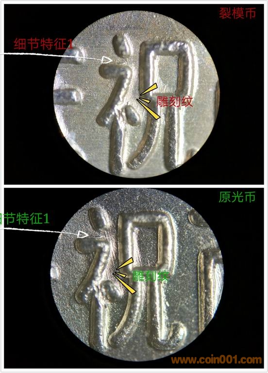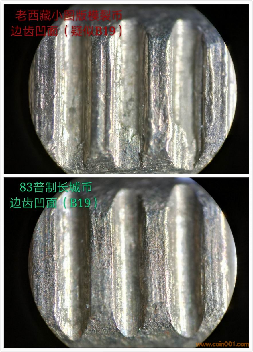 另外你說小圖版的假幣比真品還多,那模裂版是不是有假幣的可能?我先前提出的兩個(gè)現(xiàn)象,拋光痕模糊和文字與底板相交處有坡度,是假幣的特征。當(dāng)然后期的幣模上也可能出現(xiàn)文字/數(shù)字/圖案和底板的相交處模糊的情況。這又回到老問題:沒壓印幾枚怎么會(huì)出現(xiàn)模裂?模具怎么會(huì)磨損這樣厲害?