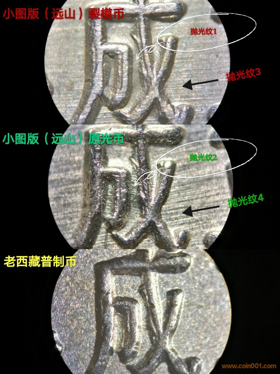所謂拋光痕 1、2壓著拋光痕 3、4 完全是因?yàn)樗鼈儾辉谝粋€(gè)平面上而造成的錯(cuò)覺(jué)。底板上的拋光痕在幣面凸出的部分會(huì)斷掉。碰巧這個(gè)凸出部分又有自己的拋光痕而已。這無(wú)法用作組合模具的證據(jù)。