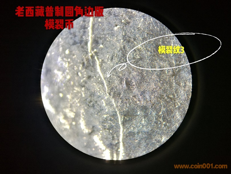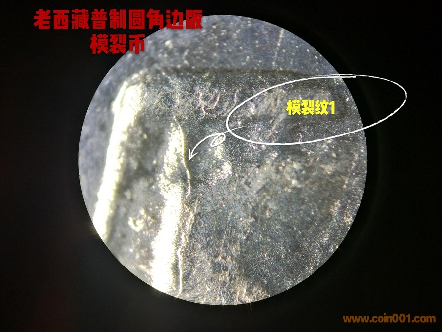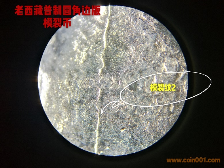 正常情況下造幣廠在發(fā)現(xiàn)這種模裂時(shí),是否有可以補(bǔ)救的措施?即通過修?;蛱硌a(bǔ)模裂,以達(dá)到延長(zhǎng)模具使用壽命的效果?但從部分老西藏模裂幣看,似乎絕大多數(shù)都是一裂到底的狀態(tài),亦伴隨雙柱的深、淺、無的現(xiàn)象。也可以理解:你裂你的,我修我的。無雙柱版模裂幣的出現(xiàn),至少目前可以佐證模裂與雙柱不存在直接的關(guān)系。下圖是出現(xiàn)兩道模裂紋的無雙柱模裂幣。