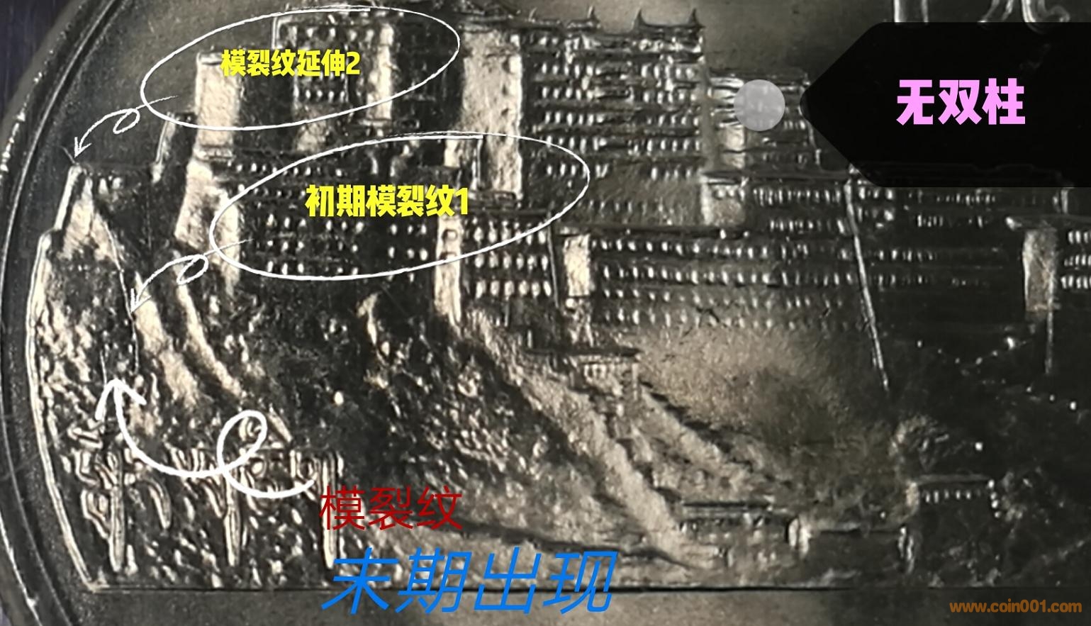 從目前發(fā)現(xiàn)的模裂幣看,早期老西藏幣的工作模確實(shí)存在整體“質(zhì)量”問題。部分工作模具在初期就發(fā)生了模具局部破裂。主要集中表現(xiàn)在布達(dá)拉宮圖案左側(cè)炮樓至下方12點(diǎn)鐘方向區(qū)域。