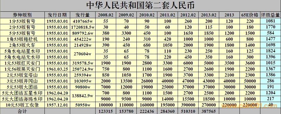 評(píng)級(jí)量排序: 大黑十、紅五元、海鷗水印、綠三元、長(zhǎng)號(hào)五分、紅一元、長(zhǎng)號(hào)一分、黃五元、黑一元、寶塔山、深版水壩、黃一角、火車頭、長(zhǎng)號(hào)二分、淺版水壩