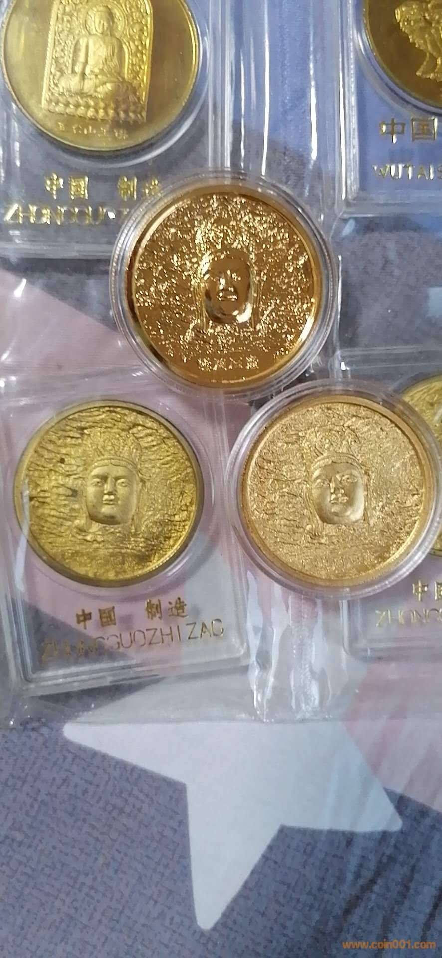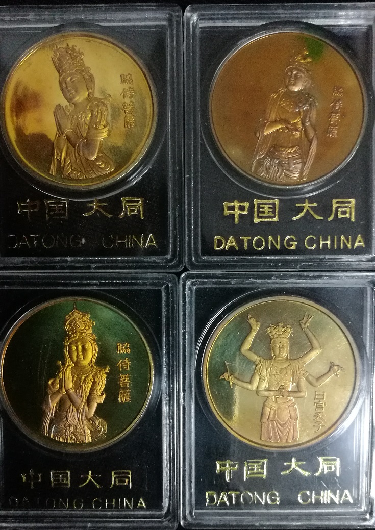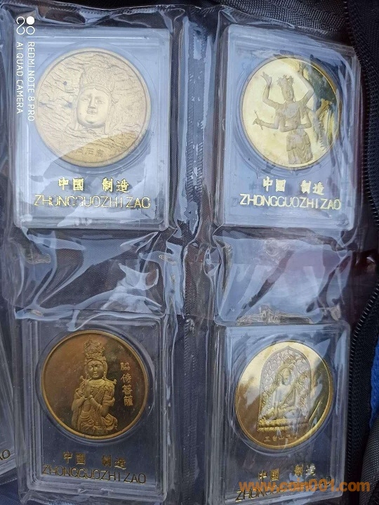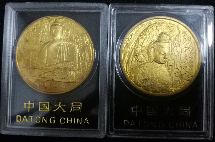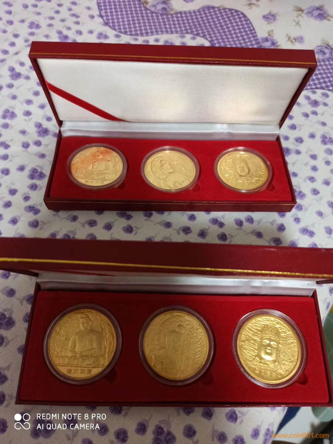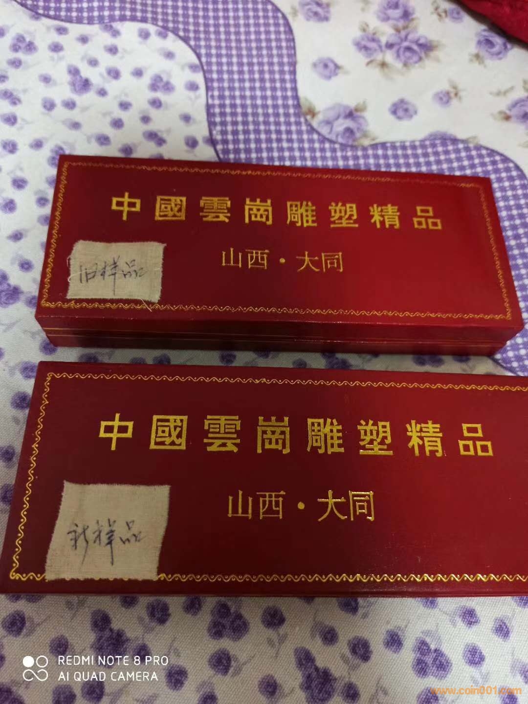 其二,一并流出的,還有兩套紅盒裝云岡石窟,分別標有“舊樣品”和“新樣品”?!芭f樣品”中為3枚“本銅”材質(zhì),但對比市場常見的金黃色澤,顏色為淺淺的淡黃色,著色有差異;“新樣品”中為3枚鍍金章,覆蓋了很多雕刻的細節(jié)。