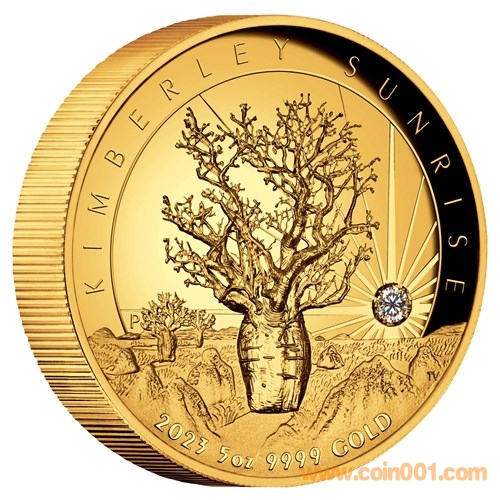 描繪了日出時(shí)分金伯利風(fēng)景中的一棵猴面包樹。地平線附近鑲嵌著一顆精美的白色鉆石,代表著冉冉升起的太陽(yáng)。設(shè)計(jì)包括銘文“KIMBERLEY SUNRISE”、珀斯鑄幣廠的“P”鑄幣標(biāo)記,以及硬幣的重量、純度和 2023 年的年份。