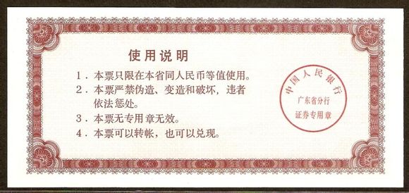 黨的十一屆三中全會(huì)確定改革開(kāi)放政策以后,廣東省經(jīng)濟(jì)建設(shè)出現(xiàn)了前所未有的高速發(fā)展形勢(shì),為了適應(yīng)經(jīng)濟(jì)飛速發(fā)展的需要,解決人民幣大面額票券缺檔問(wèn)題,中國(guó)人民銀行廣東省分行曾于1985年2月4日發(fā)行了50元和100元兩種大面額本票。兩種本票設(shè)計(jì)風(fēng)格一致,50元券為藍(lán)色,100元券為紫色。正面上方印有“中國(guó)人民銀行廣東省分行”行名,中間印有面值,面值左側(cè)豎印“本票”字樣,四角和中間下邊均有阿拉伯?dāng)?shù)字或漢語(yǔ)拼音面值,票面左側(cè)印有年號(hào)“1985”和兩種羅馬冠字七位阿拉伯?dāng)?shù)字號(hào)碼。票券背面右側(cè)印有一紅色圓形“中國(guó)人民銀行廣東省分行證券專用章”,左側(cè)印有四點(diǎn)使用說(shuō)明:“1.本票只限在本省同人民幣等值使用;2.本票嚴(yán)禁偽造、變?cè)旌推茐?,違者依法懲處;3.本票無(wú)專用章無(wú)效;4.本票可以轉(zhuǎn)賬,也可以兌現(xiàn)。
