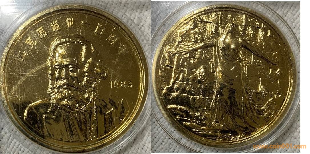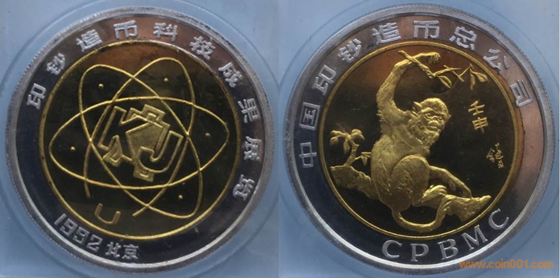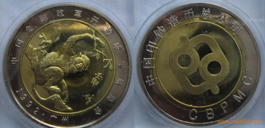 1992年制造,白銅黃銅鑲嵌精制40mm,沈幣發(fā)行。正面為印鈔造幣總公司標(biāo)志,反面為猴。