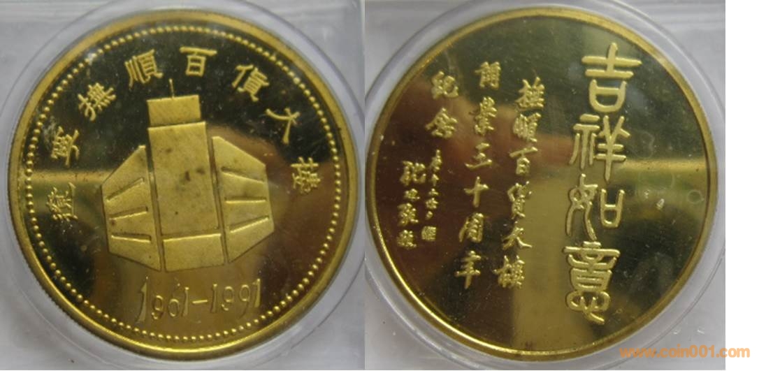 1991年制造,黃銅精制。正面為大樓,反面為文字“吉祥如意”。