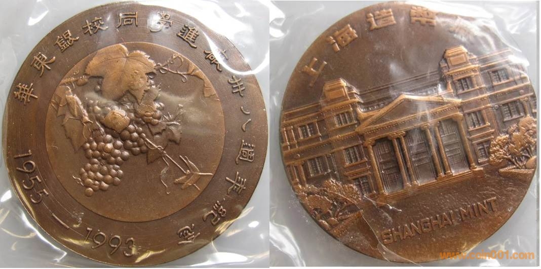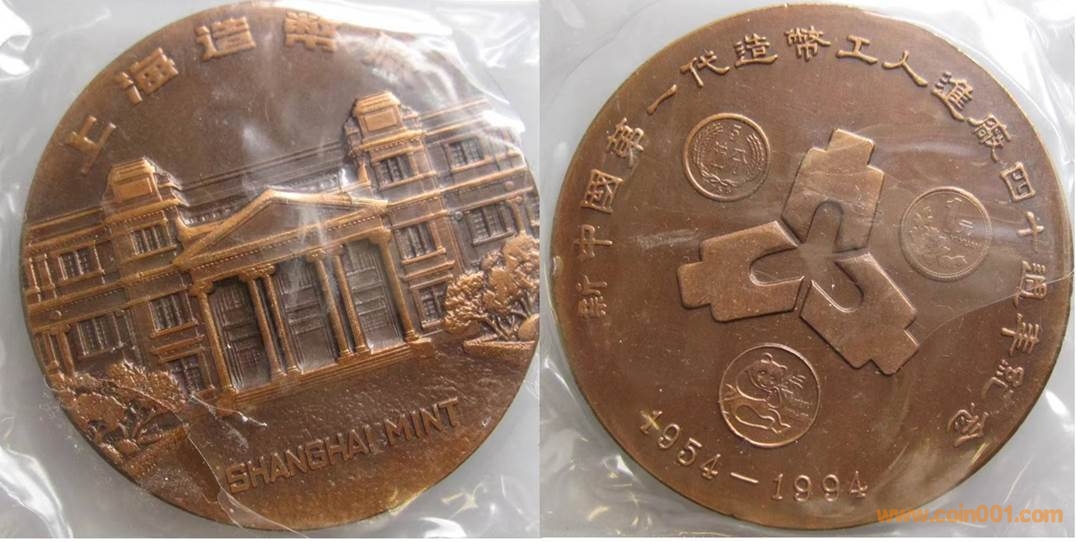 1996年制造,紫銅上色60mm,上幣發(fā)行。正面為上幣廠房,反面為長(zhǎng)城幣、分幣、角幣等疊幣圖。參考價(jià):1000-2000