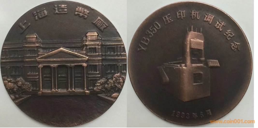 1993年制造,紫銅上色及紫銅本色60mm上幣發(fā)行。正面為YB沖壓機(jī),反面為廠房。此枚章乃是內(nèi)部未發(fā)行章,由趙薔設(shè)計(jì)雕刻的處女作,存世量十分罕見。