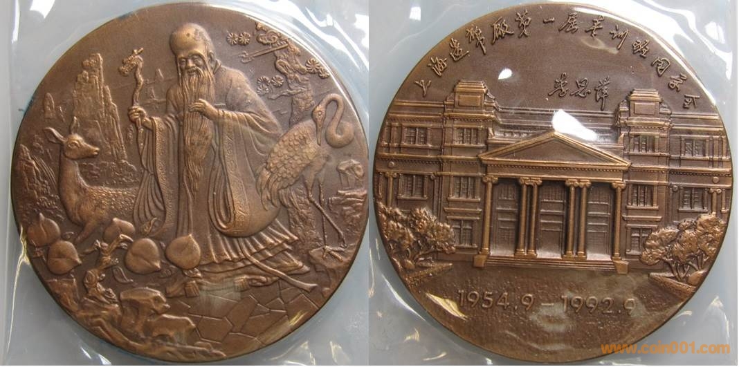 1993年制造,紫銅上色60mm上幣發(fā)行。正面為老壽星,反面為廠房。此章有仿品。參考價(jià):800-1500