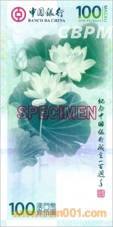 為慶祝中國銀行百年華誕,中國銀行于二零一二年二月發(fā)行了“紀(jì)念中國銀行成立一百周年”澳門鈔(簡(jiǎn)稱“百年紀(jì)念鈔”),面值為壹佰圓。受中國銀行委托,中國印鈔造幣總公司承擔(dān)了這枚紀(jì)念鈔的設(shè)計(jì)、制版和印制。中國銀行澳門分行與中國印鈔造幣總公司共同策劃,確定主題,最終鈔票正面主景圖案為中國銀行總行大廈,主色調(diào)為金色,背面是凹印中國水墨蓮花圖,主色調(diào)為綠色。百年紀(jì)念鈔采用了多層次水印、動(dòng)感安全線、光彩光變圖案、接線號(hào)碼等多項(xiàng)公眾防偽特征,使公眾易于辨識(shí),另具有多項(xiàng)機(jī)讀防偽特征,可供銀行機(jī)具清分鑒別。