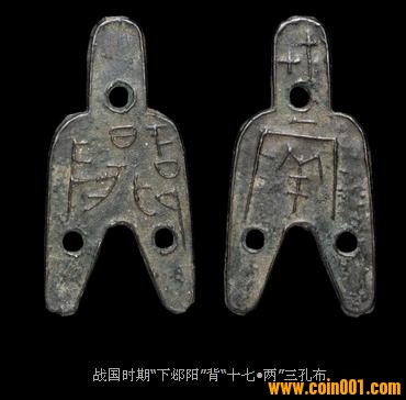 戰(zhàn)國(guó)時(shí)期下邲陽(yáng)十七?大型三孔幣320萬(wàn)的成交價(jià)成為古錢幣的標(biāo)王,從其介紹來(lái)看為先秦貨幣中著名的珍品,傳世幾歷二百年,流傳有序,被10多本著作收錄。