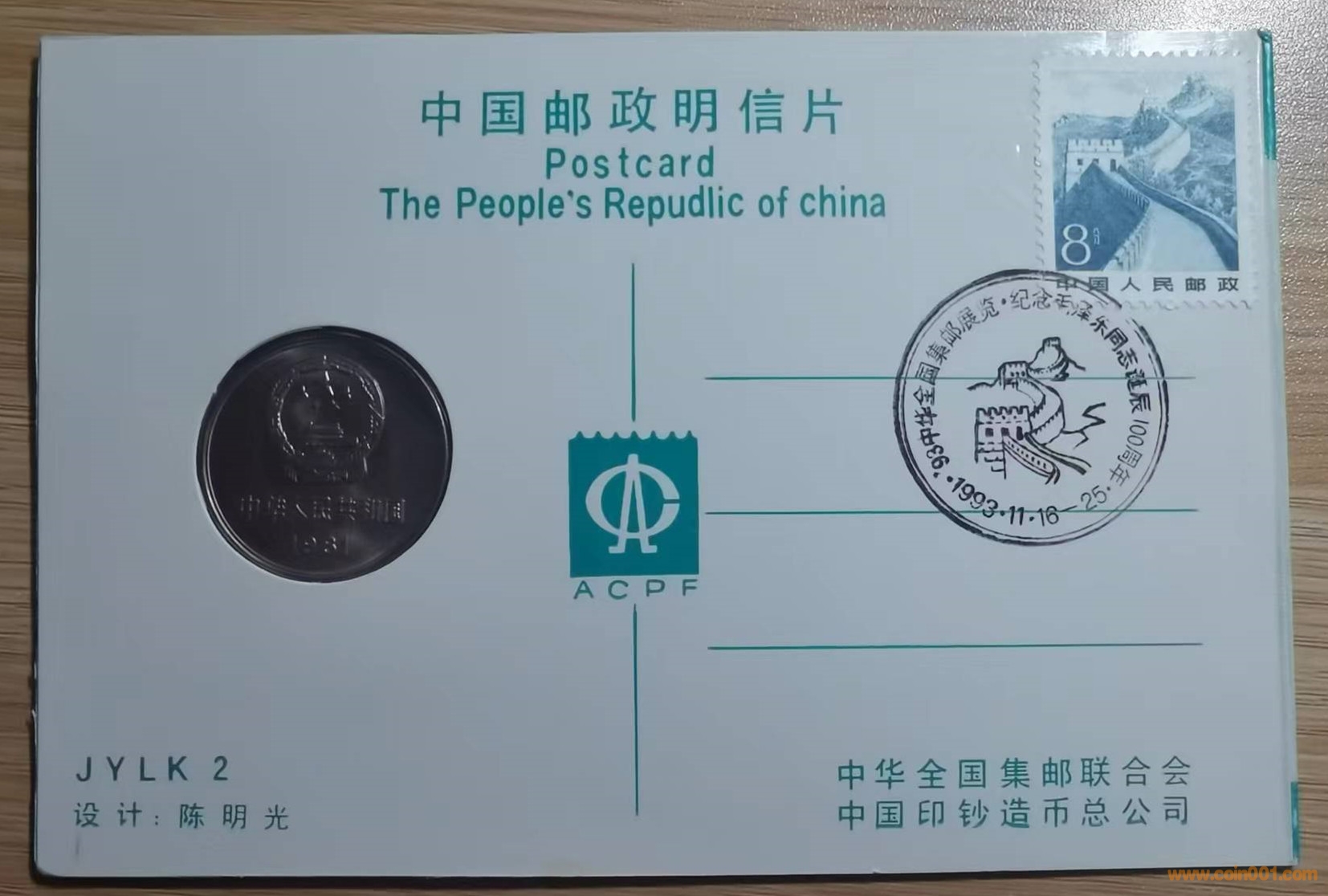 93年由中華全國(guó)集郵聯(lián)合會(huì),中國(guó)印鈔造幣總公司聯(lián)合發(fā)行——JYLK2《93中華全國(guó)集郵展覽——紀(jì)念毛澤東同志誕辰100周年》明信片鑲嵌81年長(zhǎng)城幣封2萬(wàn)枚,發(fā)行后發(fā)現(xiàn)存在兩個(gè)低級(jí)錯(cuò)誤:一:明信片上英文Republic錯(cuò)為Repudlic;二:中國(guó)英文China,錯(cuò)為中文瓷器china。