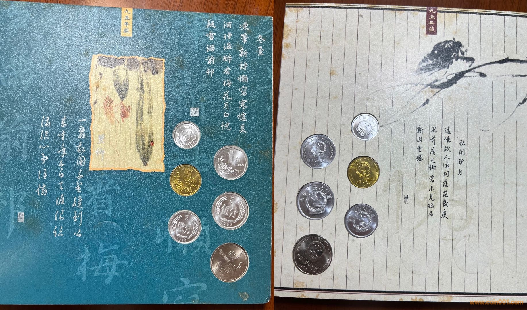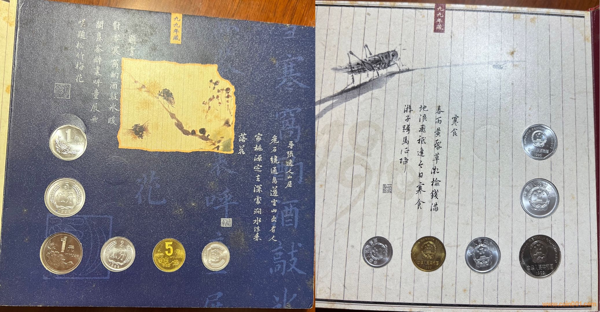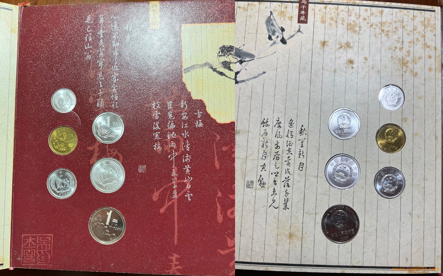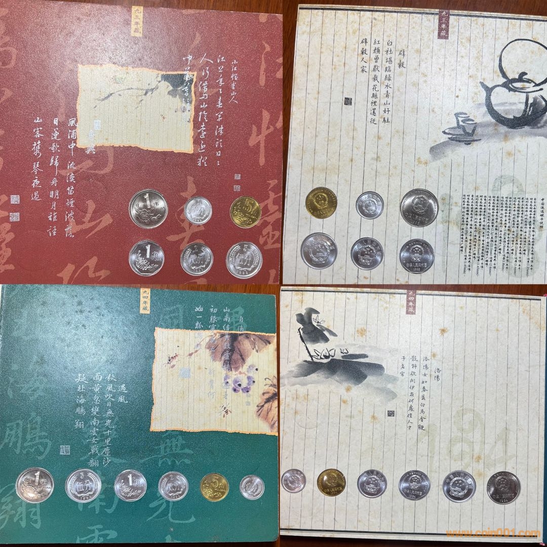 今從本網(wǎng)站、他網(wǎng)站偶得金、銀版《碎銀閑趣》數(shù)冊,“冊中詩文水墨與閑銀碎幣巧妙融合,無不浸透生活點滴帶來的閑情逸致和人生感悟,全冊詩情畫意,讀來趣味盎然”。上海老藏家印先生的除外包裝略微有些陳舊,其余品相精美,金冊與一市場常見略有差別,冊邊為銀色,91年、92年硬幣放置布局與常冊有異?!端殂y閑趣》發(fā)行于2000年,距今有23年了,我關注此冊也有15、6年了,但從發(fā)行到現(xiàn)在,關注度一直不高,各網(wǎng)站售賣的冊中硬幣也常常留有指紋,細微之處可見當時工人裝幀時的漫不經(jīng)心?!端殂y閑趣》裝幀的每枚硬幣、每張紙幣都熠熠生輝!