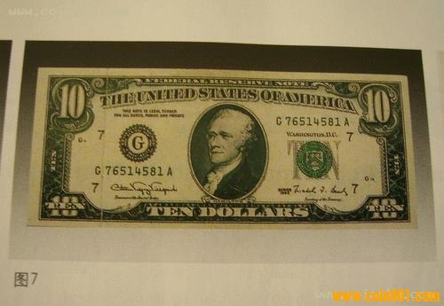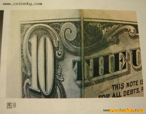 圖7、8所示為美元10元?dú)垘?。這張美鈔的左側(cè)存在明顯的折痕,折痕展開后可見印刷空白,也系紙張折疊所致。