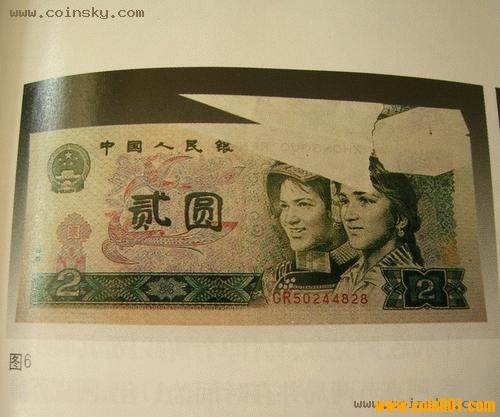 圖6所示為第四套人民幣2元?dú)垘拧?980年版人民幣中發(fā)現(xiàn)有1張2元券,由于紙張沒有裁齊而折疊起來,致使幣面上的人物圖像及文字嚴(yán)重受損,成為一張殘幣。
