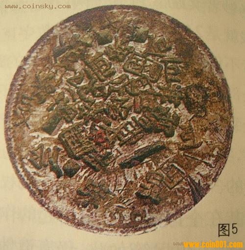 圖3所示為“‘餉’字錯(cuò)版銀幣”。清光緒三十三年(1907年)新疆鑄造“餉銀”錢幣。其中一種正面珠圈內(nèi)為漢文“餉銀五錢”4字,珠圈外為維文“餉銀五錢”,背面為線圈蟠龍,左右各有一小花。該幣正面漢文“餉”字的“食”旁少了最后一筆,成為“餉”字錯(cuò)版。