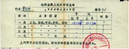 在2010年5月下半月《錢幣報(bào)》刊登的一篇由孫克勤老師、陳志宏老師合寫的文章(題目:1980版長城樣幣)中,提及了陳志宏老師發(fā)現(xiàn)《四種金屬人民幣樣幣發(fā)單》,發(fā)單記載的內(nèi)容為:【行名鄄城,1980年4月10日,編號92,樣幣號碼原來是14364-14370,后涂改為14365-14371,上列樣幣點(diǎn)收無誤后,請將回單聯(lián)蓋章退回省行出納處等字樣和“中國人民銀行山東省分行”的騎縫印章】。