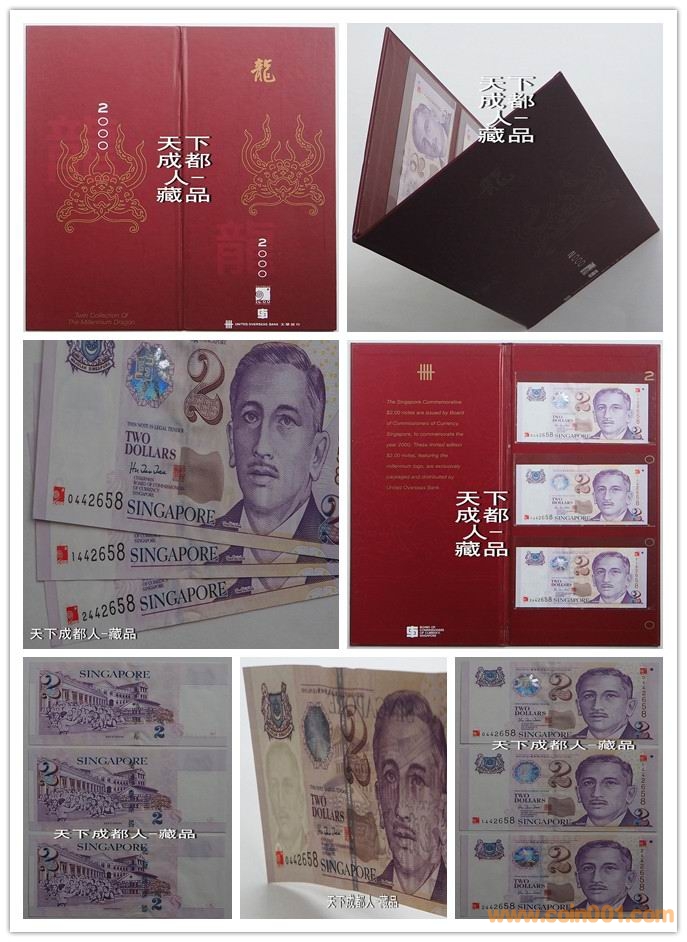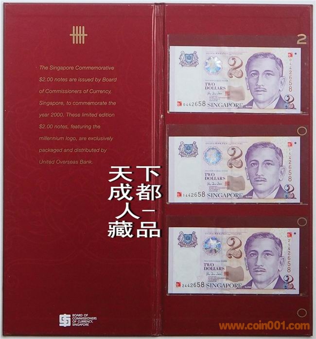 方形紅色標識、刊“2000”字樣、3張鈔尾數(shù)6同號(442658#)以示珍貴。大華銀行原折式卡冊精美包裝,隨印中英文介紹。
