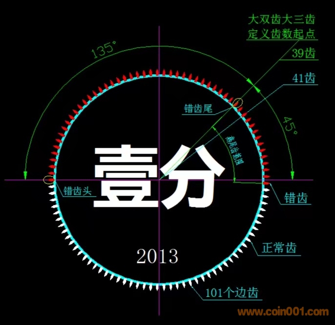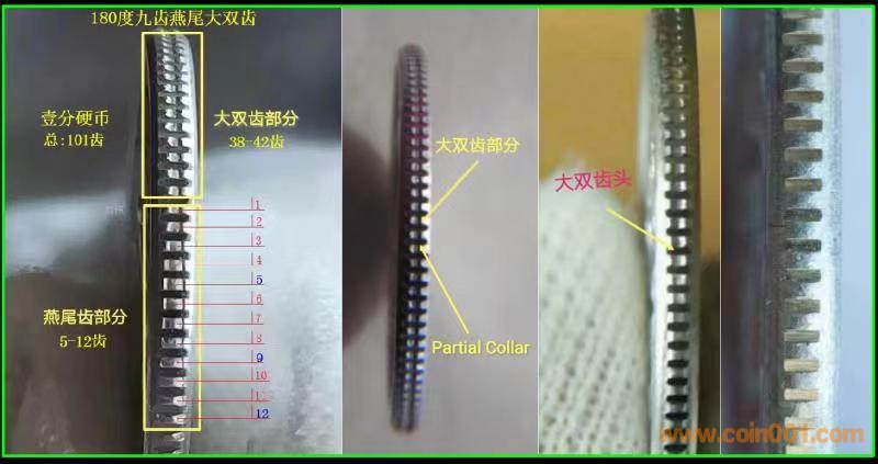 第二,131壹分硬幣邊齒總數(shù)是101齒,其中大雙齒、大三齒錯幣的錯齒數(shù)量能到達到41齒左右,加上6-9齒的燕尾齒,竟達到半圈的邊齒錯誤,且具有“小批量、標準化、范圍大、一眼清”的特點。