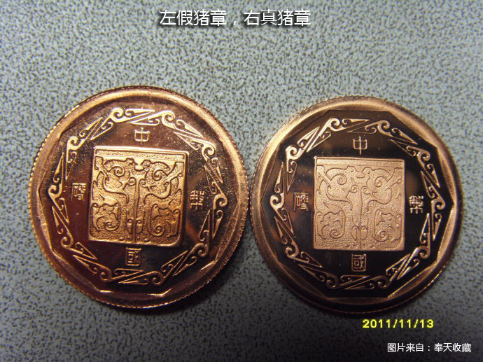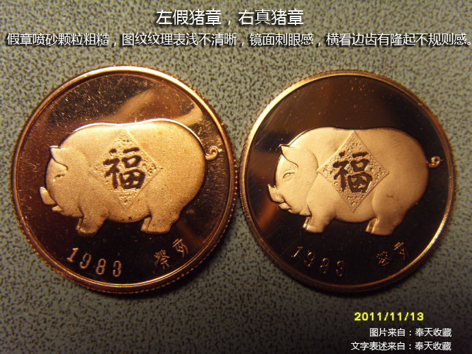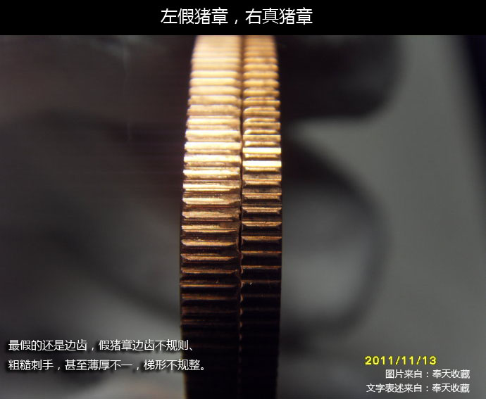 “奉天收藏”王老師,去年11月,有發(fā)表過豬章的真假對(duì)比文章。