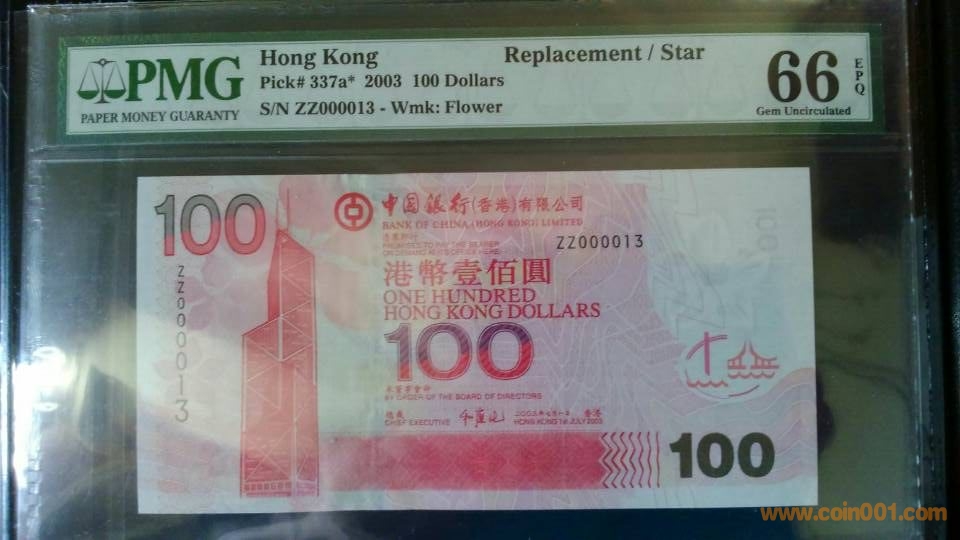 2003年香港上海匯豐銀行壹仟圓,補(bǔ)號(hào),ZZ113311,PMG,66,EPQ, 3600元