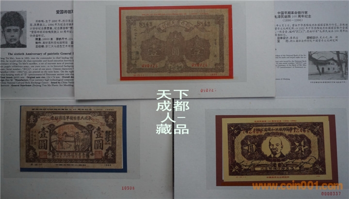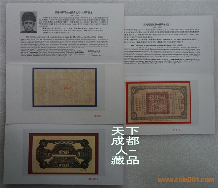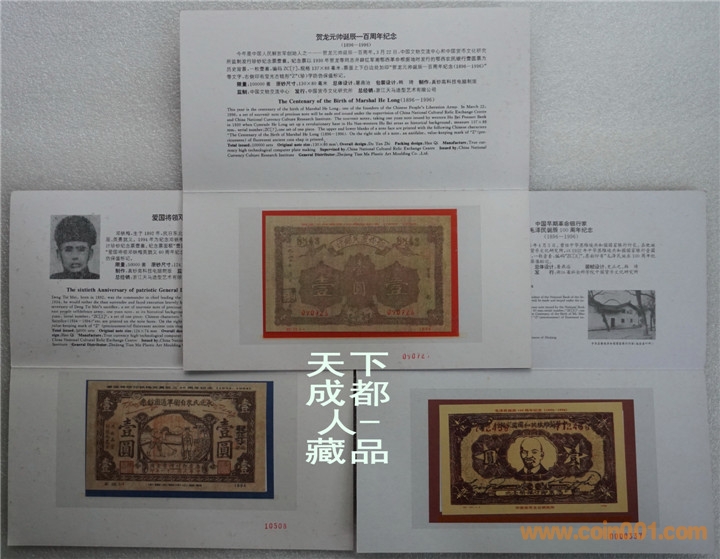 紅色珍鈔“Z”(珍)系列紀(jì)念票:九十年代中國文物交流中心、浙江省社會(huì)科學(xué)院中國貨幣文化研究所、上海印鈔廠等聯(lián)合制作發(fā)行《“Z”(珍)賀龍?jiān)獛洝⑻K維埃國家銀行行長毛澤民、愛國將領(lǐng)鄧鐵梅各珍鈔紀(jì)念票》各一冊共3冊/組;該紅色珍鈔均以其通用鈔票為歷史背景詳細(xì)圖文并茂介紹,真鈔高科技電腦制版印刷;各紀(jì)念票右側(cè)均印有瑩光古錢形“Z”(珍)防偽保值標(biāo)記,以資紀(jì)念。各珍鈔紀(jì)念券冊具有較高鑒賞學(xué)習(xí)收藏價(jià)值(品如實(shí)物圖):