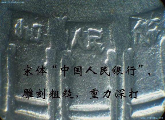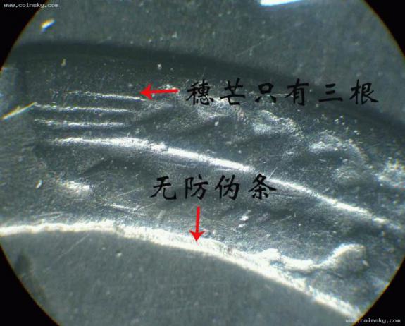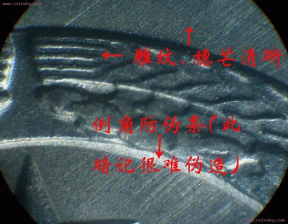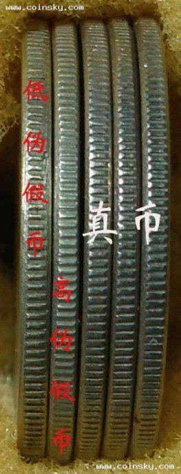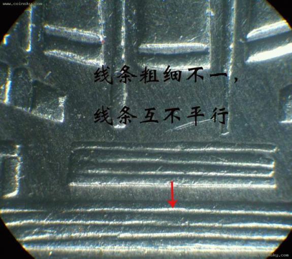 假幣從感觀上灰白帶有淡黃銅色,手摸粗糙,有的還會刮手,重9.633克,比真幣重0.333克,邊飾不均勻,內(nèi)圓有偏心、厚薄不一;背面“中國人民銀行成立四十周年”“銀”字第三筆與第一、二筆相聯(lián),周年的“周”字中間的“吉”字筆劃不清楚,有的相連,總行辦公樓和中心樓墻體線條明顯不直且粗細(xì)不一,有擁擠感,屋頂二個方塊大小不一,不均勻,左邊小方塊不方正,左角有尖峰狀。凹下部分發(fā)亮;圓形中心樓頂部凹下部分有明顯砂眼和微小氣泡,真品銀白色,贗品陰暗色;正面國徽麥穗紋路不清,手摸有凹陷感,天安門前的華表沒有立體感,有左無右,有右無左,有的只有半節(jié),有的甚至全無,中文文字缺乏力度和立體感,五角星凸感不強(qiáng),顯得粗笨,這種現(xiàn)象是造假者翻砂脫摸時用力不勻所致。從邊齒上看,由于偽品是用開放式壓制,齒邊垂直面的兩端直角常常會出現(xiàn)毛刺,造假者用微型銼刀去除毛刺時,往往會留下細(xì)小的銼痕,而這種銼痕在真品中是沒有的,集幣愛好者用高倍放大鏡仔細(xì)觀察這個部位便可發(fā)現(xiàn)真?zhèn)巍?