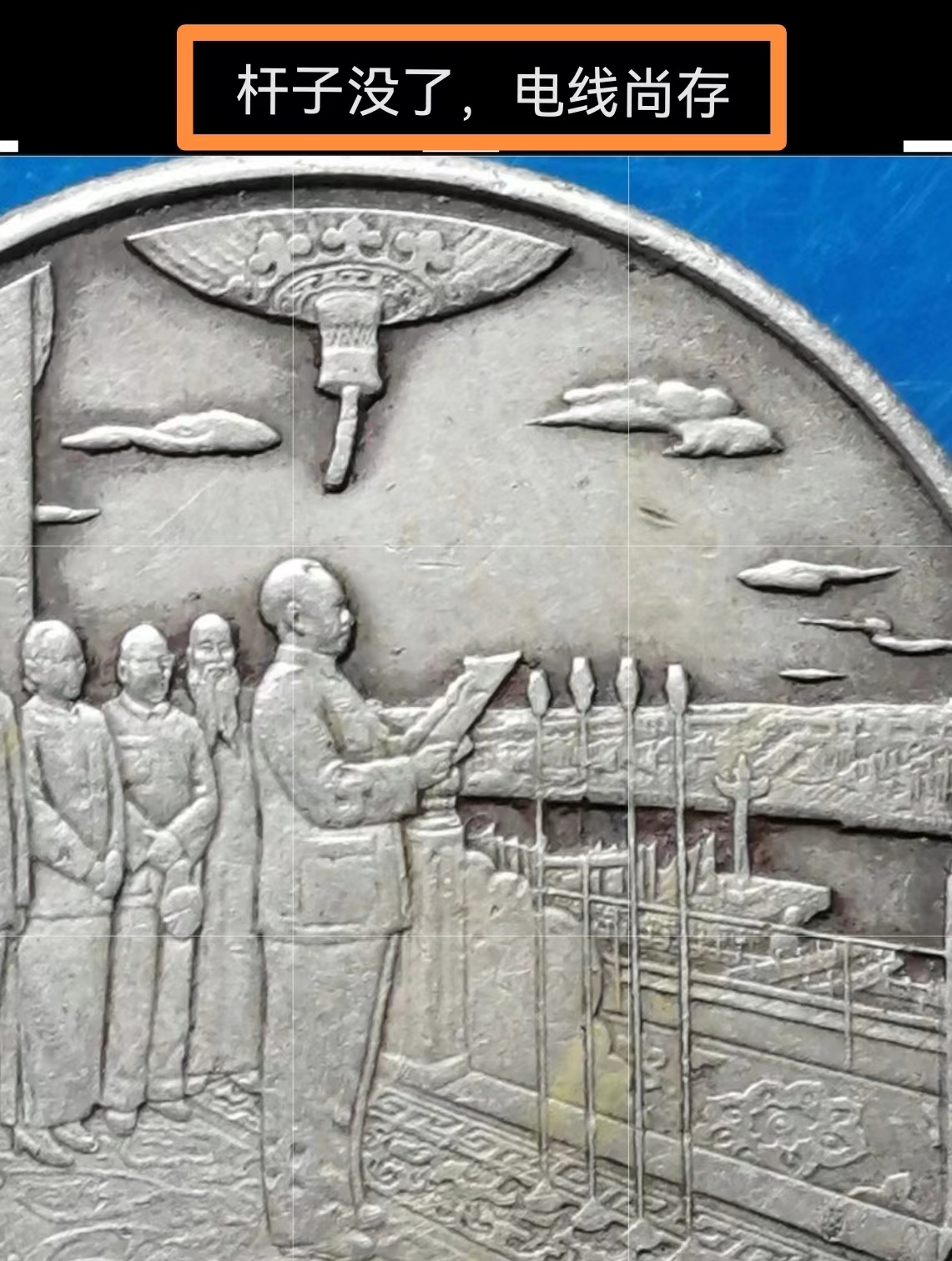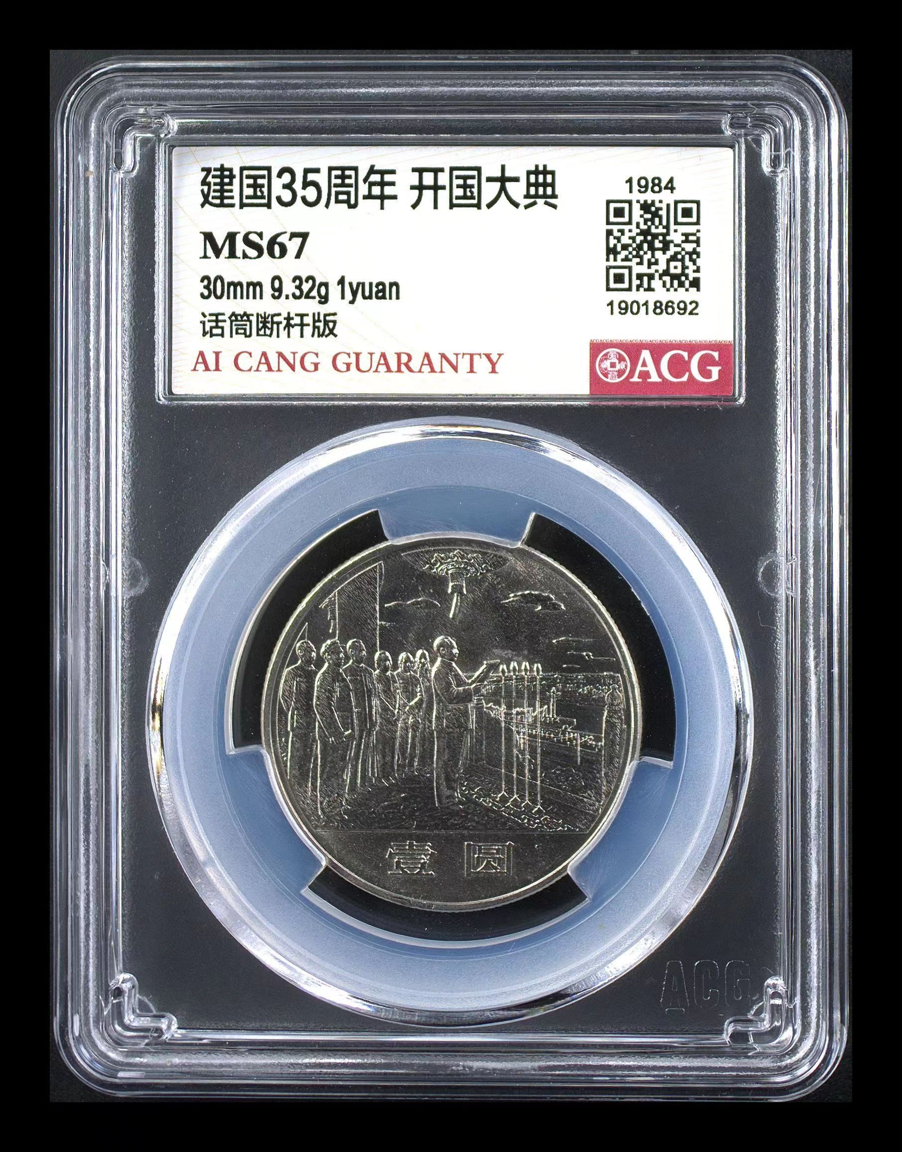 1984年建國35周年普制紀(jì)念幣開國大典“話筒斷桿版”,系沈陽造幣廠生產(chǎn),數(shù)量推測是一副模具以正常壓印十萬枚來計(jì)。