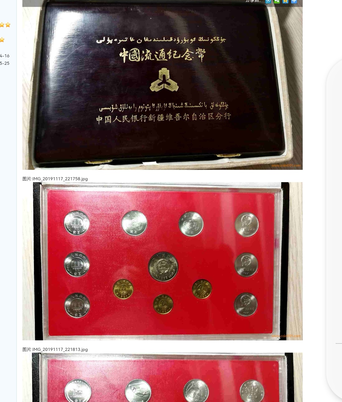 據(jù)現(xiàn)代錢幣網(wǎng)幾位朋友曾發(fā)布的交易帖,說中國(guó)人民銀行新疆分行的絲綢木盒套幣是新疆早期作為禮品發(fā)給銀行內(nèi)部員工的。從建35到1993年的宋慶齡為止。盒子包裝漂亮,外盒絲綢,里面木盒。目前,發(fā)現(xiàn)三種顏色,分別為乳白色、綠色和褐色。里面木盒有紅色、磨砂黑色和光面黑色。至于盒子里的錢幣品相,都為原光。