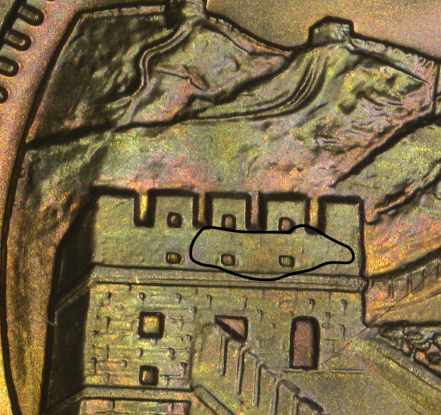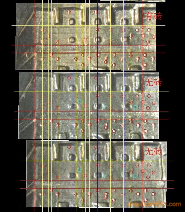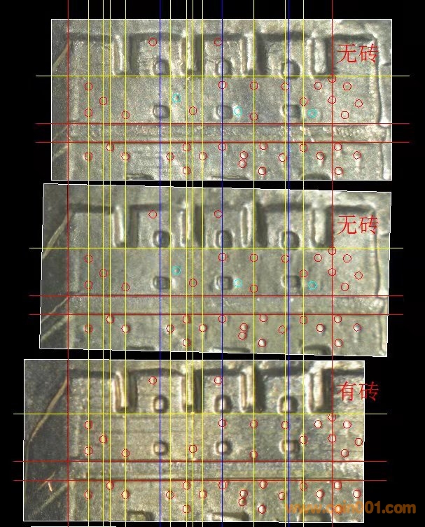 看起來,磚墻銜接縫的痕跡位置基本一致。唯一可惜是我的疊圖軟件出了問題,否則能夠更明確兩種版別幣的磚墻銜接縫位置關(guān)系。