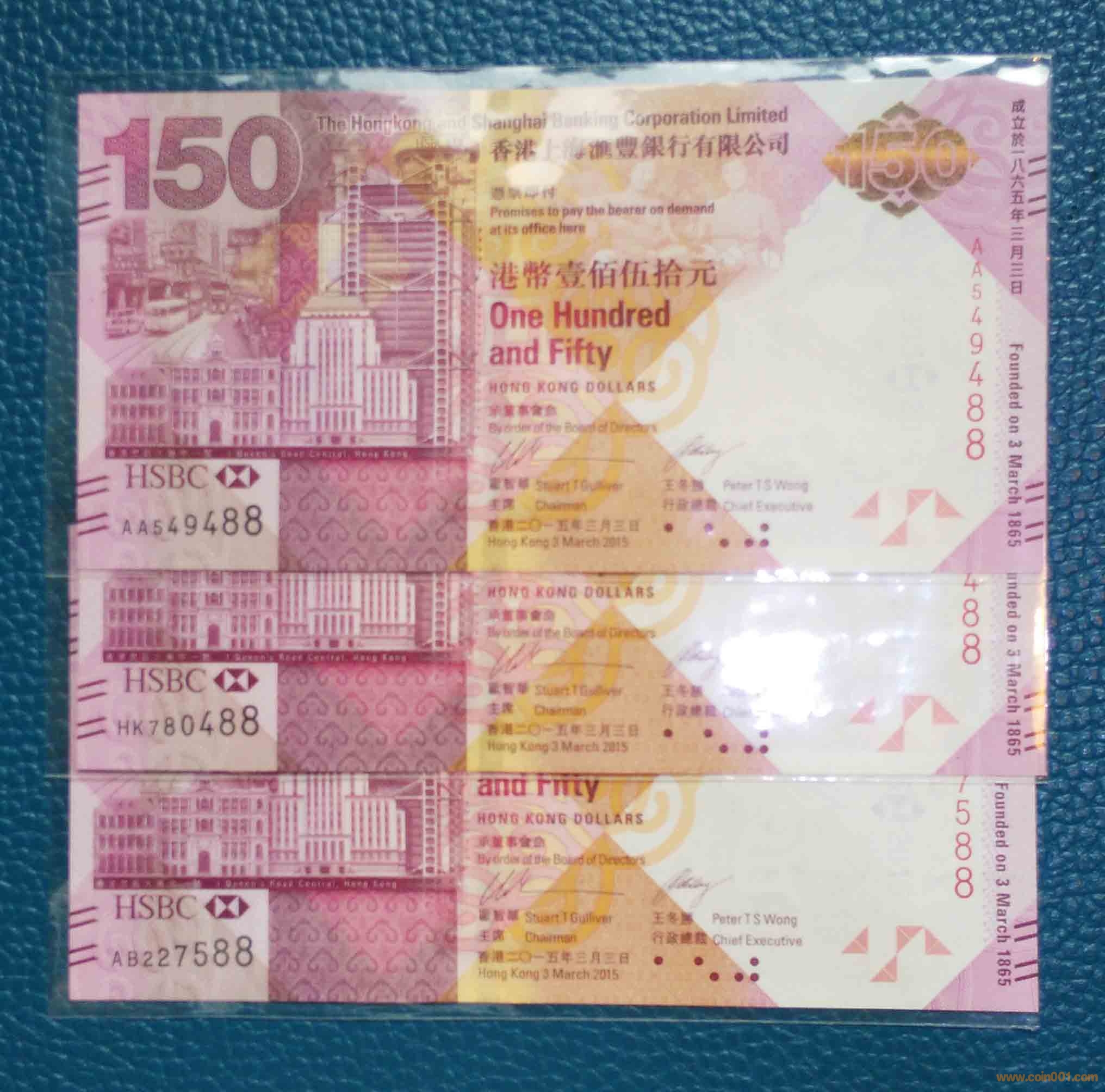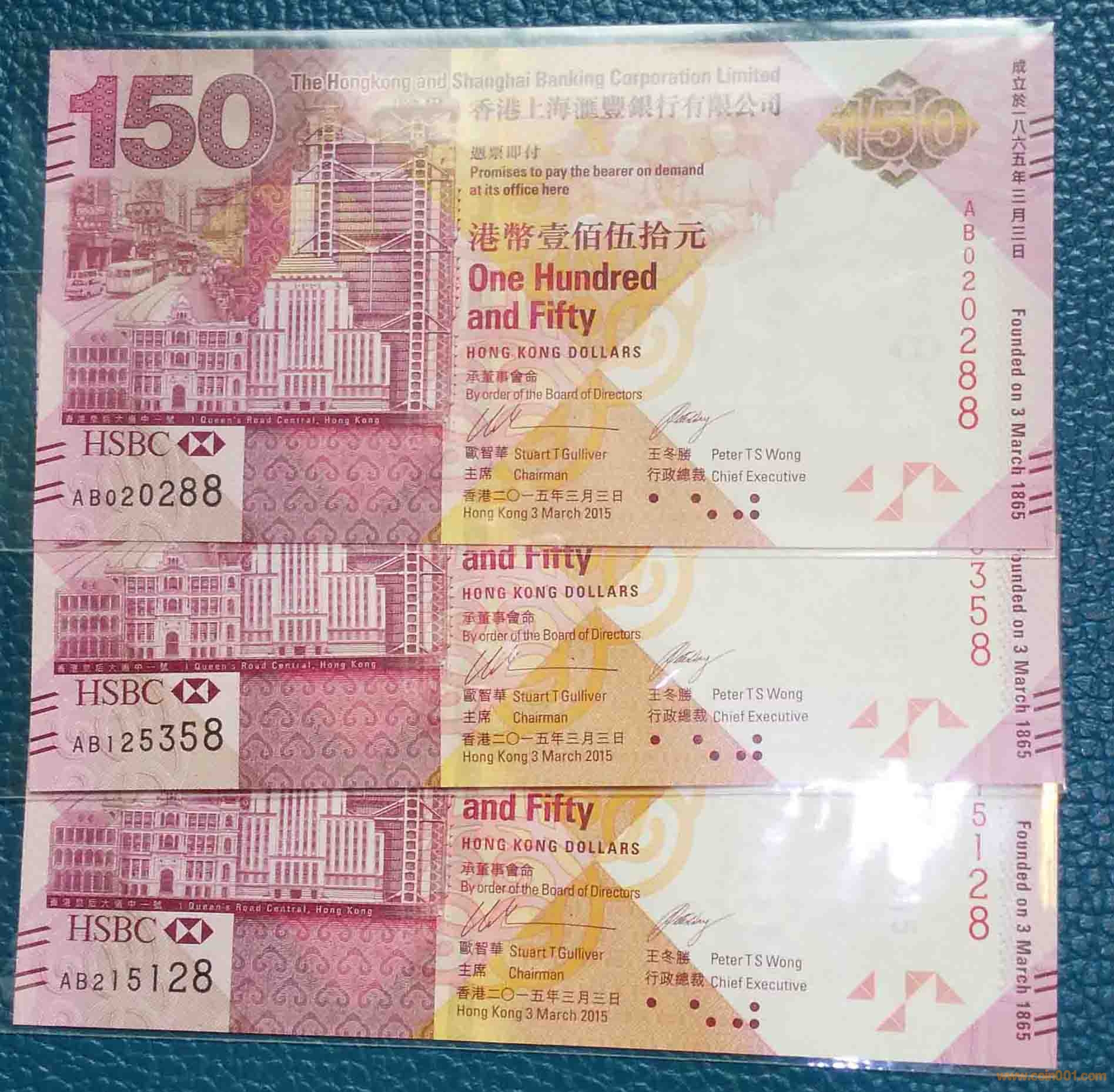 2015年香港匯豐150紀(jì)念鈔三連體:AA 85-86-874588,原裝帶冊(cè) 2800元