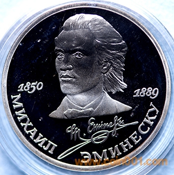 第46枚:作家埃米內(nèi)斯庫逝世100周年紀(jì)念 ,1989年12月26日發(fā)行,直徑31毫米.