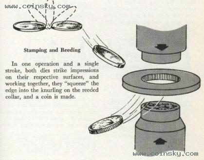 第二張圖里英文寫得清清楚楚這道工序是stamping and reeding,也就是說圖案壓印和邊齒成型是同時的。