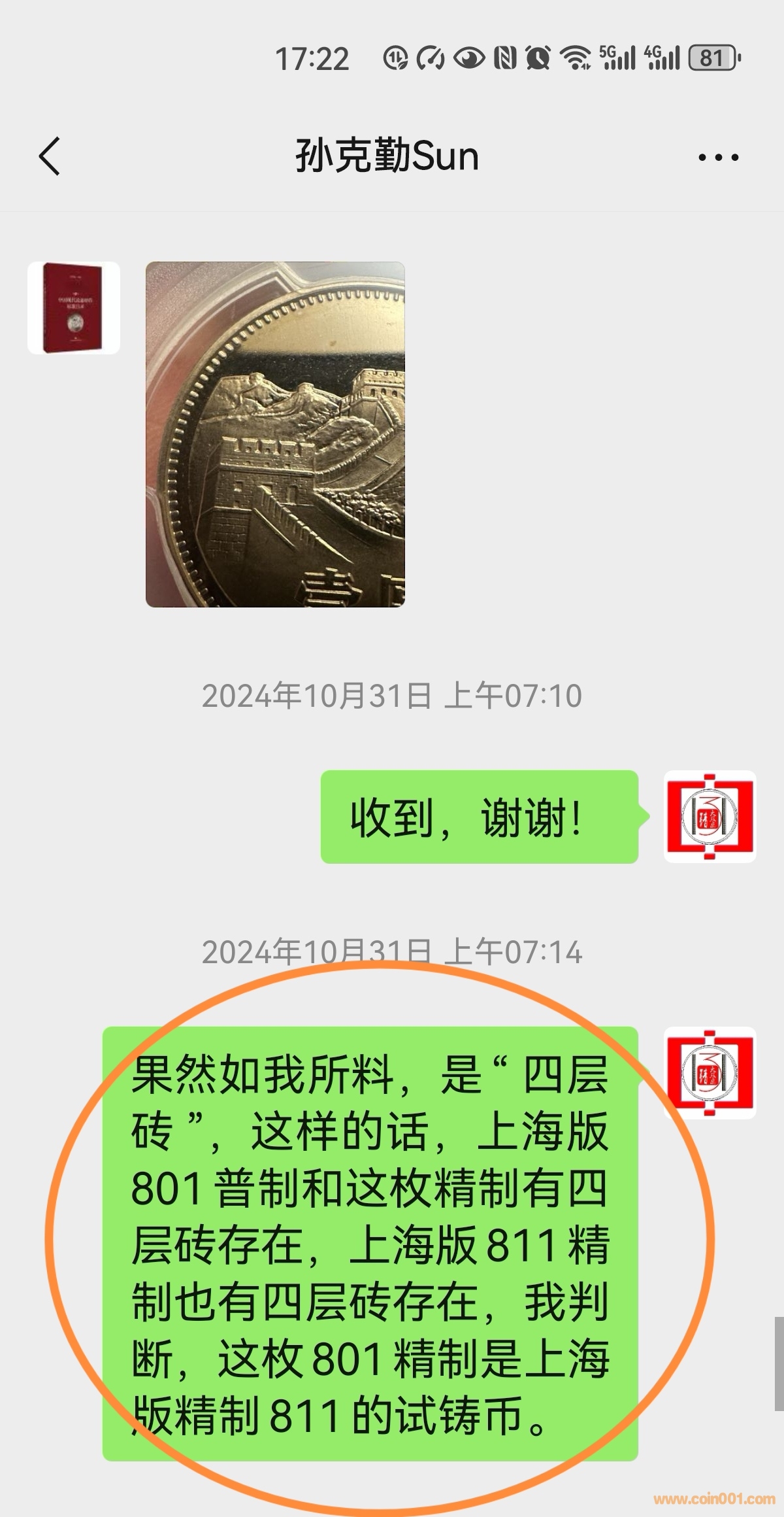 引用 引用第190樓131大雙齒錯于2025-04-23 22:39發(fā)表的 :關(guān)于上海版長城幣的研究和801上海版精制試鑄幣研究和結(jié)論我的研究和結(jié)論:1、上海版長城幣原模有2副,1980年原模(簡稱801原模)和1985年原模(805原模);2、1980/1981/1982/1983/1984的上海版長城幣,全部五個年份的長城幣都是由801原模翻印的工作模壓印的;也即五個年份上海版長城幣,不論是有磚和無磚、普制幣和精制幣、三層轉(zhuǎn)和四層小磚、大磚和小磚,無論啥班別,包括錯鑄班別,都來自同一個原模,即801原模;.......