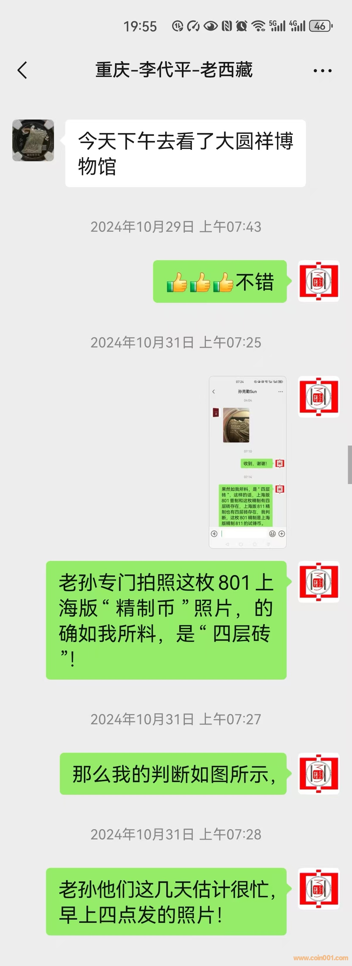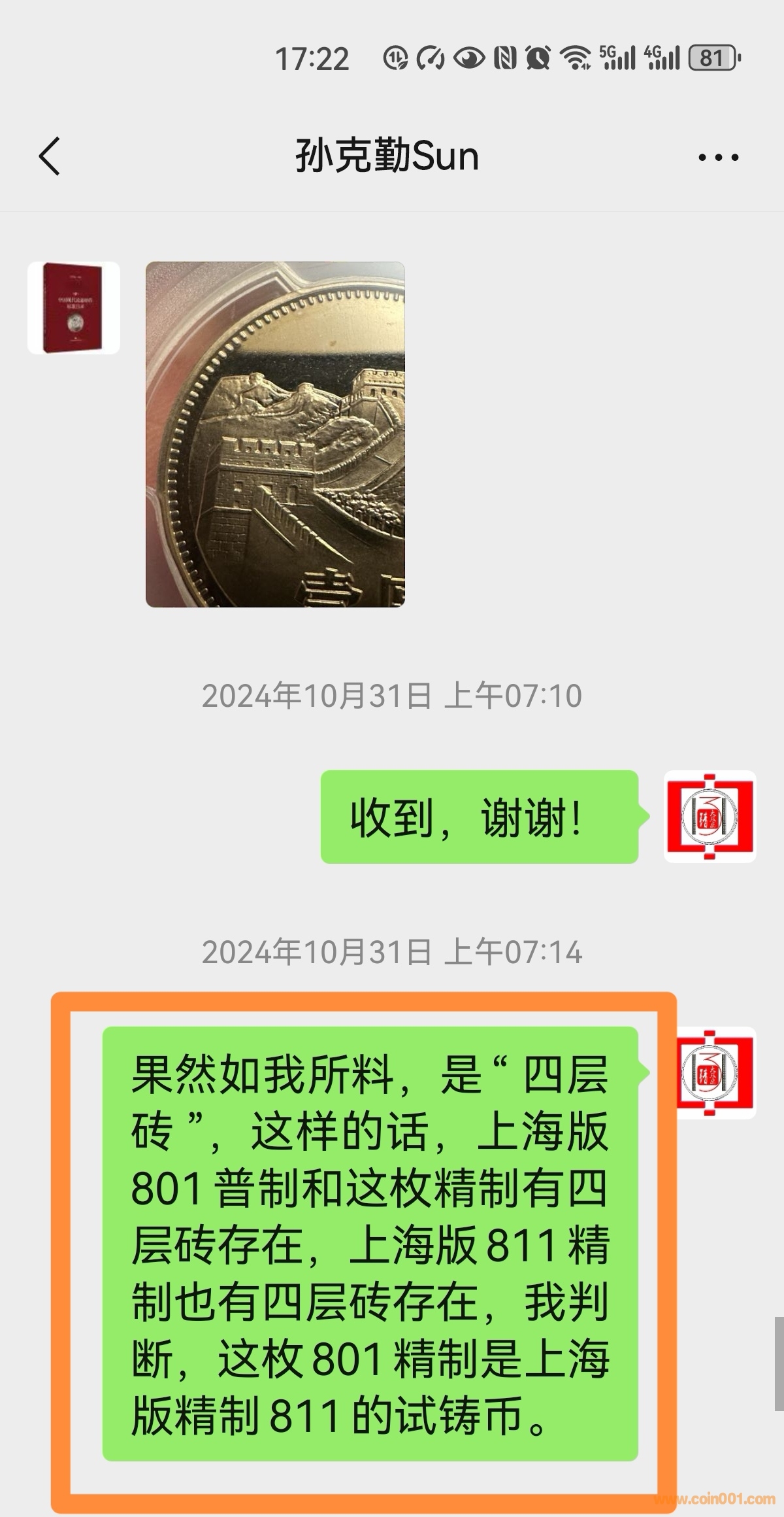 我后來(lái)通過(guò)對(duì)上海版長(zhǎng)城幣模具和幣的進(jìn)一步研究,發(fā)現(xiàn)811既有普制又有精制幣,有普通磚和四層小磚,801也有普制的四層小磚,801和811四層小磚存世量都很小,這就讓我想到了那枚多年來(lái)懸而未決的“801長(zhǎng)城精制幣”,因此,我就找李代平先生要這枚“801精制幣”的清晰圖片研究,后來(lái)李總告訴我,他拍的和留存的這枚“精制801幣”的圖片也不清晰,于是讓我向?qū)O克勤老師要照片,第二天早上四點(diǎn)多鐘就發(fā)給我了,2024年10月31日早上我一看,我馬上于7點(diǎn)14分就回復(fù)了孫克勤老師,回復(fù)了我得出的結(jié)論:“果然如我所料,是“四層磚”,這樣的話(huà),上海版801普制和這枚精制有四層磚存在,上海版811精制也有四層磚存在,我判斷,這枚801精制是上海版精制811的試鑄幣?!保⑦M(jìn)一步得出我的結(jié)論:801長(zhǎng)城幣發(fā)現(xiàn)的精制幣是真實(shí)存在的,不是不少人認(rèn)為的“臆造幣”或“假幣”!