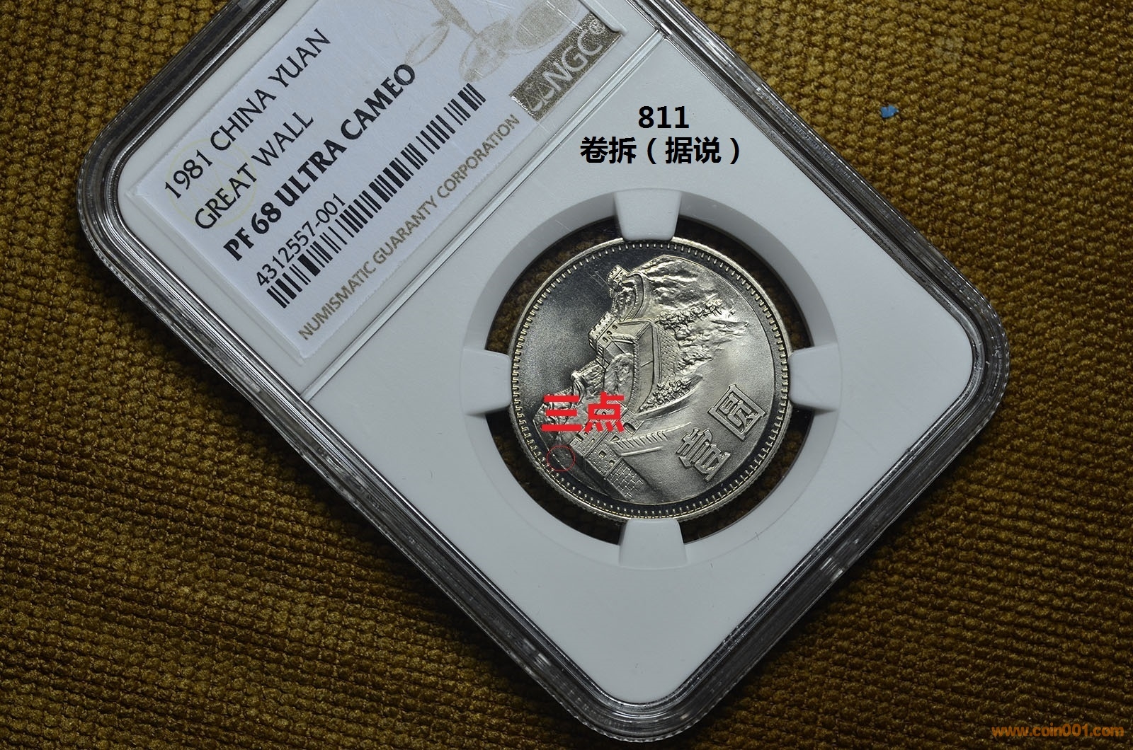 4、“三點(diǎn)”特征只有上海版1980/1981/1982/1983/1984長(zhǎng)城幣五個(gè)年份的才有,且對(duì)應(yīng)年份的普制幣和精制幣都有,到上海版1985普制幣,就已經(jīng)沒(méi)有這個(gè)“三點(diǎn)”特征了,而是啟用了沒(méi)有“三點(diǎn)”凸起的新模具;