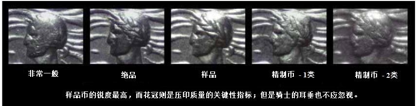 印模磨損、弱打和拋光初打幣具有細(xì)密亞光(matte)或織紋絲光(satin)底板,花冠及馬的眼睛非常飽滿。隨著印模的磨損,底板表面出現(xiàn)不平,而花冠和馬的眼睛逐步喪失清晰度(圖4)。用后期印模壓印的錢(qián)幣上高點(diǎn)出現(xiàn)模糊。研究時(shí)要仔細(xì)觀察其粗糙不平的底板表面和幣圈上是否有流通痕跡,以確認(rèn)其細(xì)節(jié)損失的確是由印模磨損所造成。