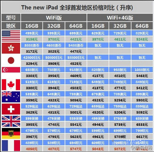 The new iPad全球首發(fā)地區(qū)價(jià)格對(duì)比(升序)