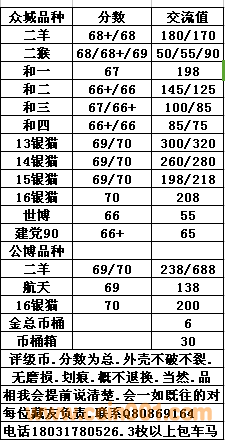 以下品種,不議論價(jià)格, 標(biāo)價(jià)為 單枚價(jià)格. 評(píng)級(jí)幣以評(píng)級(jí)分?jǐn)?shù)為準(zhǔn),不接受以品相為理由的挑刺,請(qǐng)見(jiàn)諒.。以上品種 2000元以上 包郵寄,低于2000 ,費(fèi)用自理. 價(jià)格詳見(jiàn)圖表 另可代購(gòu)內(nèi)蒙特產(chǎn)牛肉干。奶酪。蘑菇干