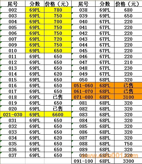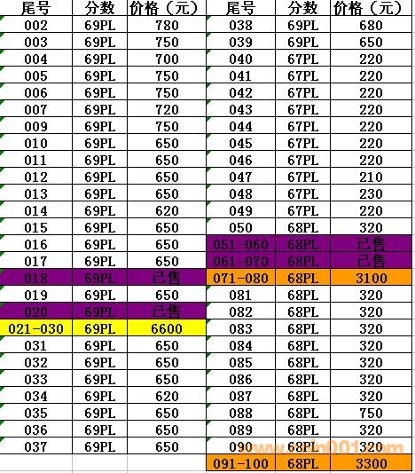 這次航天新標(biāo)衛(wèi)星標(biāo)限量不超過4000枚發(fā)行(實(shí)際是否到這個(gè)數(shù)還很難說)。商家普遍惜售。而且這次號(hào)碼和分?jǐn)?shù)對應(yīng)帶有隨意性和以往不同。好多串號(hào)001開始先給你68分的,然后才出69分的。所以001開始的69分標(biāo)十更是稀少(可參考別的送評的網(wǎng)友)。尾號(hào)和對應(yīng)價(jià)格具體見表格。單枚包快。二枚以上包順豐。附官網(wǎng)圖為今天重新查詢的結(jié)果。僅作參考。日后數(shù)量變動(dòng)以當(dāng)時(shí)實(shí)際數(shù)為準(zhǔn)。多網(wǎng)同售,先到先得。數(shù)量有限。機(jī)會(huì)切莫錯(cuò)過。