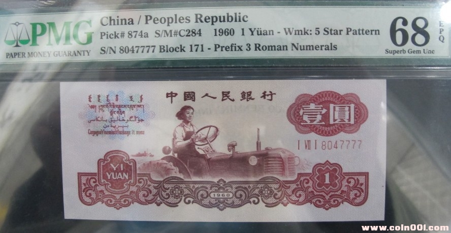 3.三版1元拖拉機(jī)三羅馬分?jǐn)?shù)為68EPQ\號(hào)碼為7777獅子號(hào)。價(jià)格2000元。